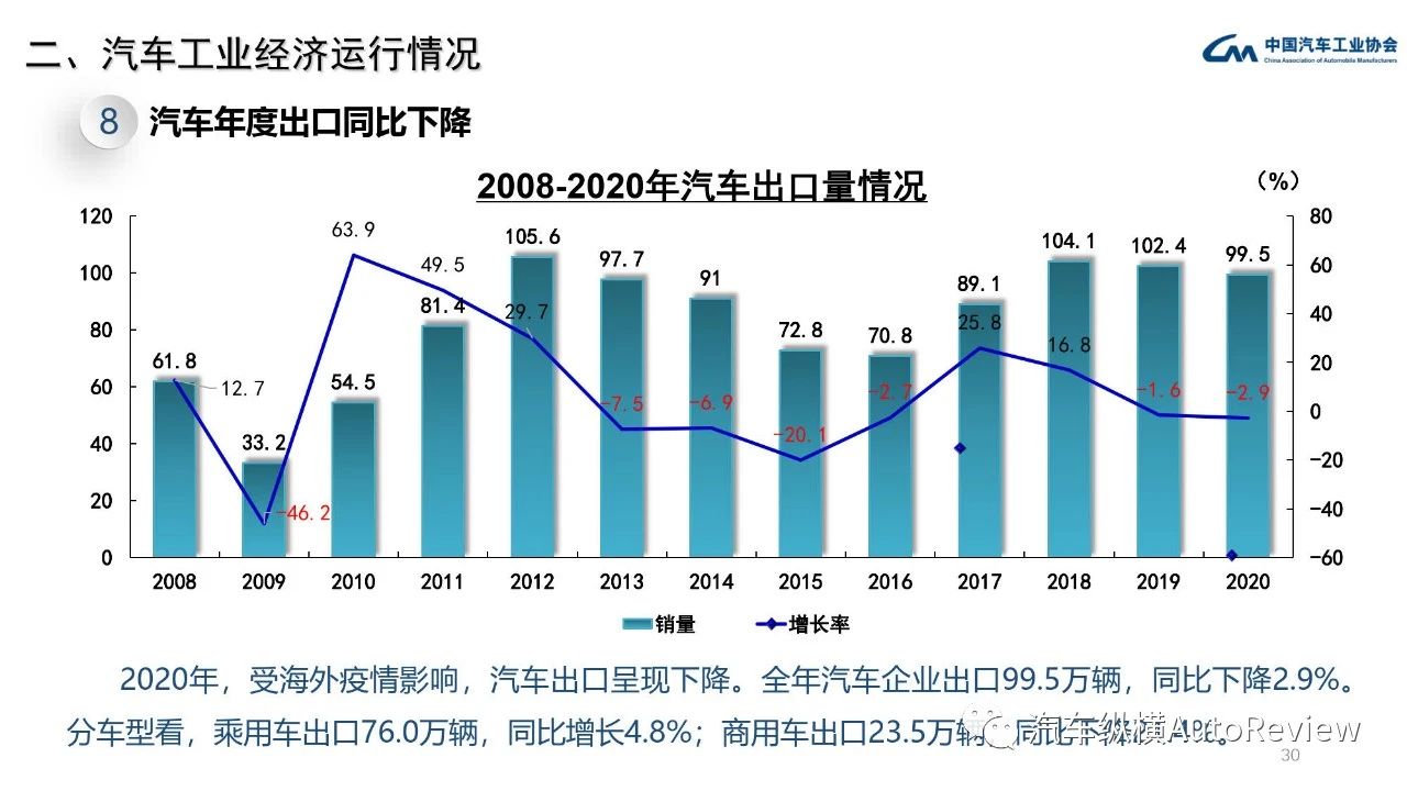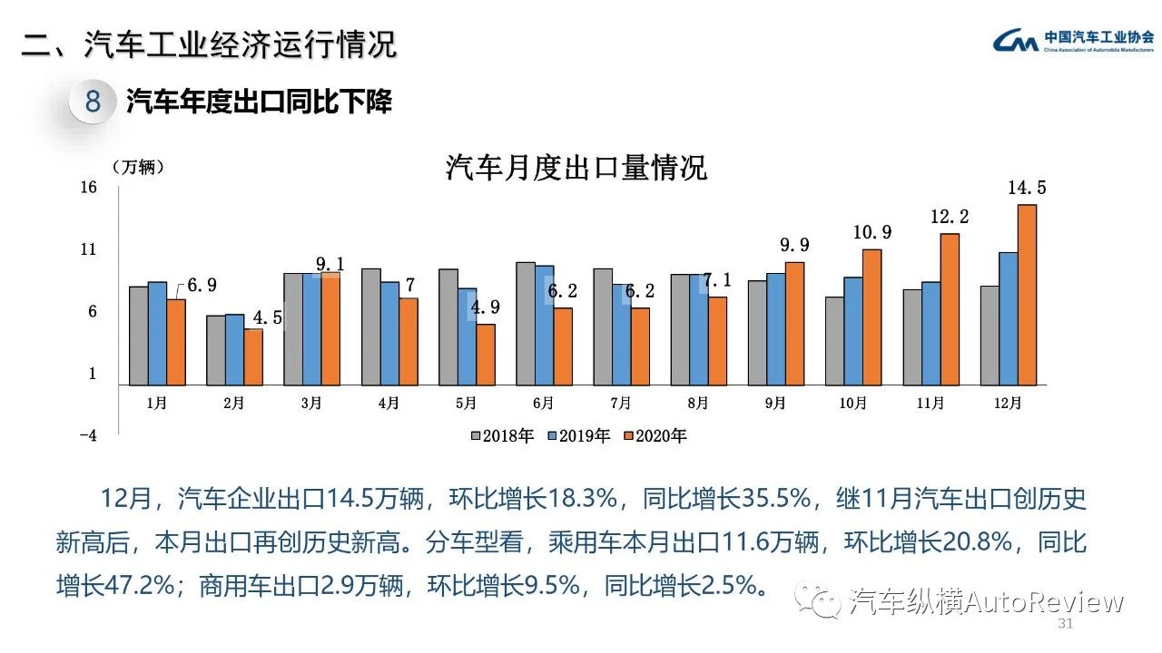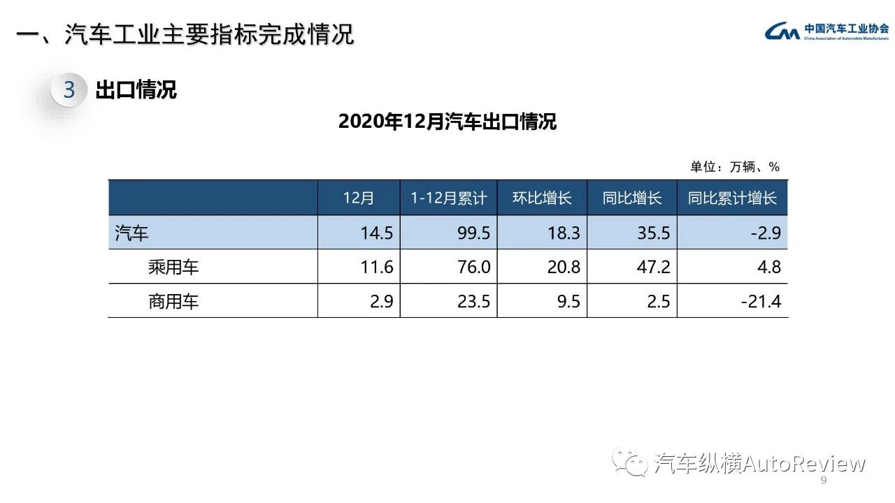 ➅ 汽车出口:2020年12月出口量14.5万辆,增长35.5%;2020年全年累计出口量99.5万辆,下降2.9%