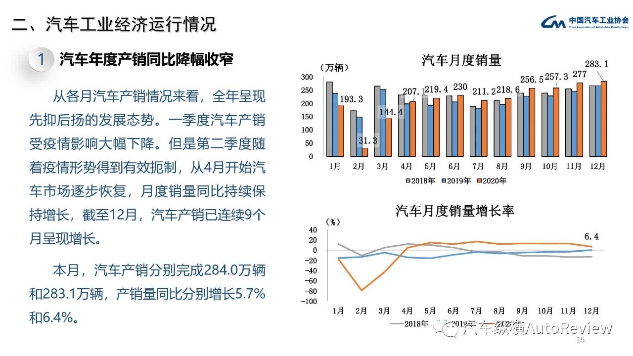 ➀ 汽车整体:2020年12月销量283.1万辆,增长6.4%;2020年全年累计销量2531.1万辆,下降1.9%
