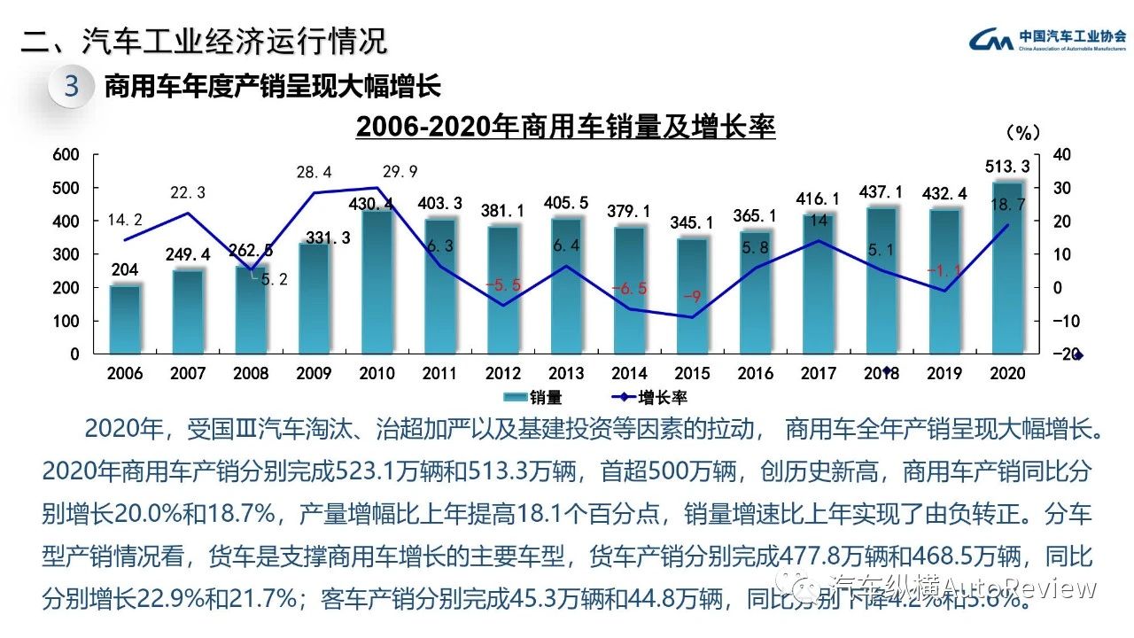 ➂ 商用车:2020年12月销量45.6万辆,增长2.4%;2020年全年累计销量513.3万辆,增长18.7%