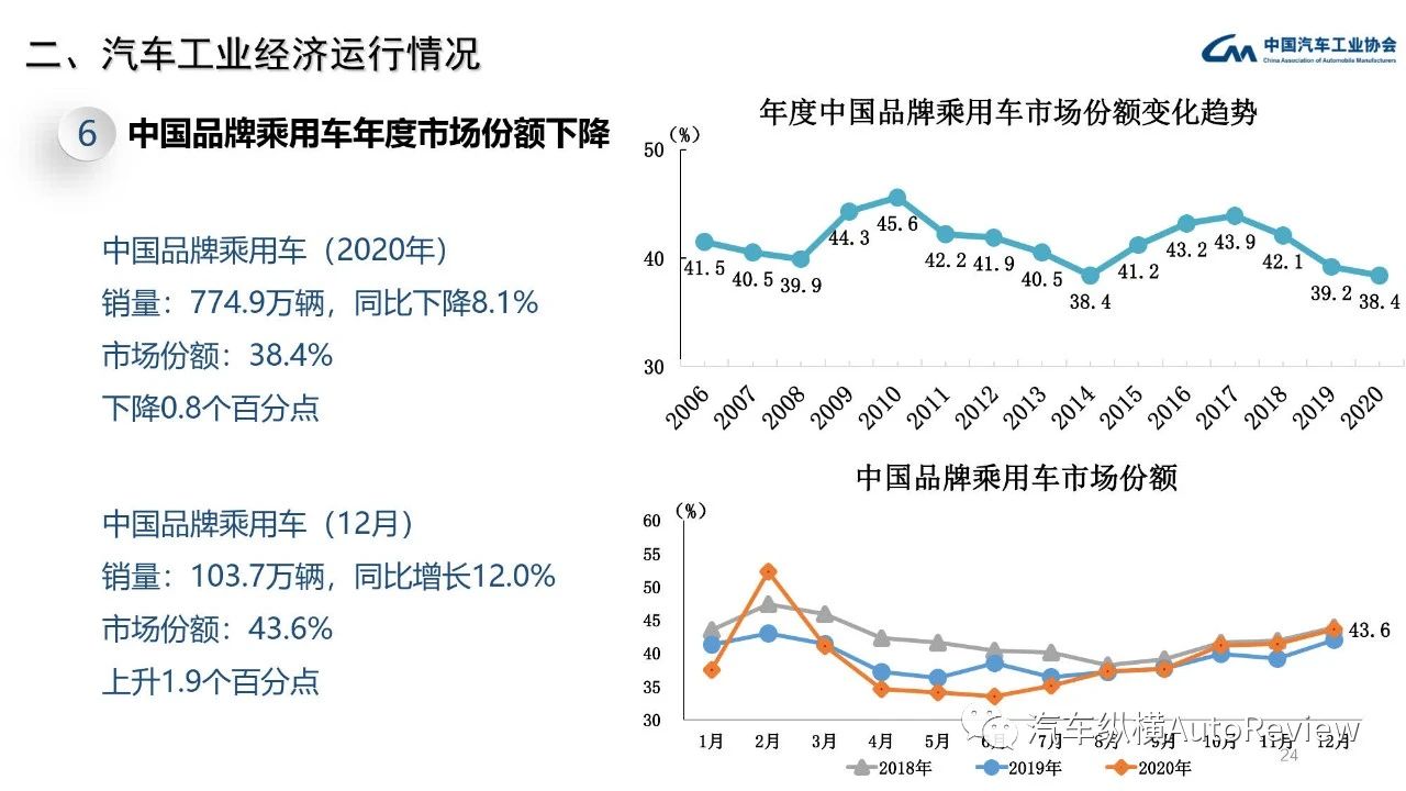 ➄ 中国品牌乘用车:2020年12月销量103.7万辆,增长12.0%;2020年全年累计销量774.9万辆,下降8.1%